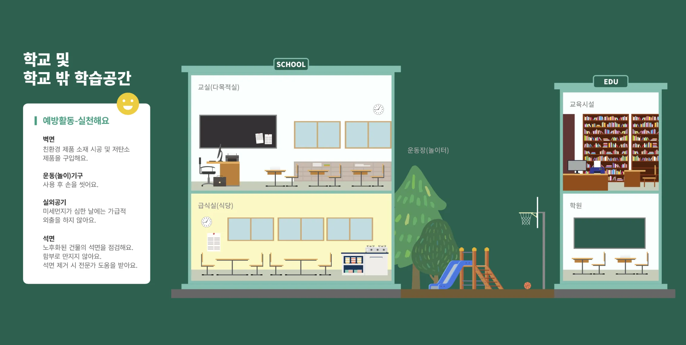 학교 및 학교밖 학습공간은 교실(다목적실 포함), 급식실(식당), 운동장(놀이터 포함), 학원 및 교육시설로 구분합니다.