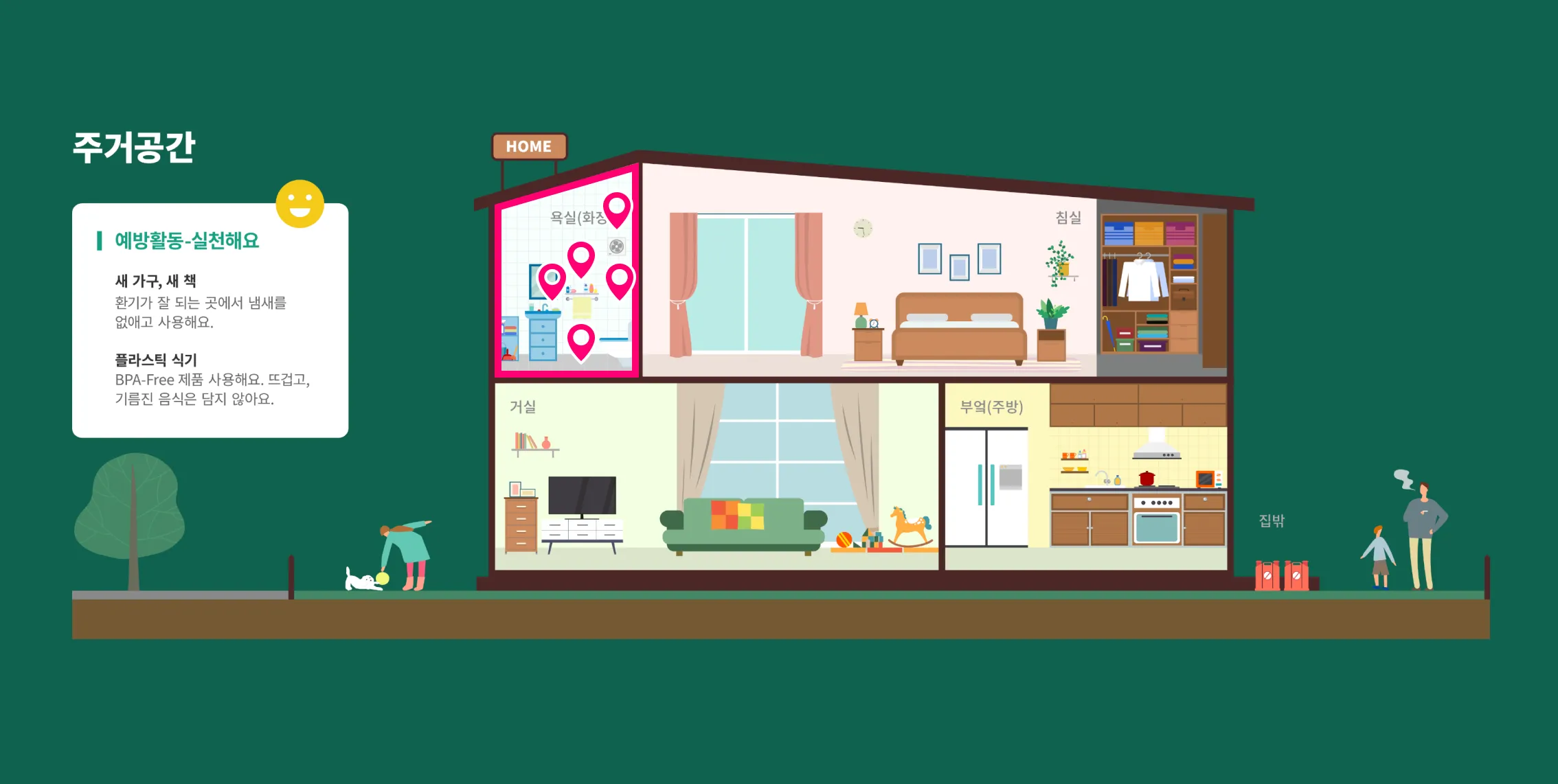 주거공간(욕실) 생활 속 환경유해인자 - 세정제, 욕실 용품, 비누, 세제, 방향제, 타일, 환기구 구분되어 있습니다.