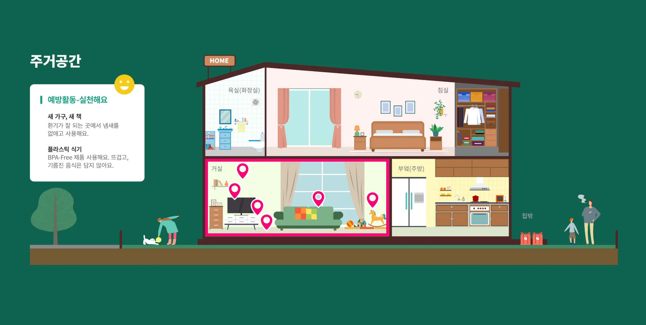 주거공간(거실) 생활 속 환경유해인자 - 벽면, 카펫, 건전지, 새가구, TV, 어린이용품 구분되어 있습니다.