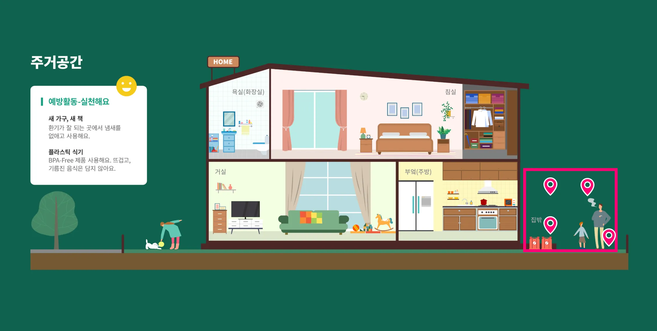 주거공간(집밖) 생활 속 환경유해인자 - 토양, 제초제, 실외 공기, 직·간접흡연 구분되어 있습니다.