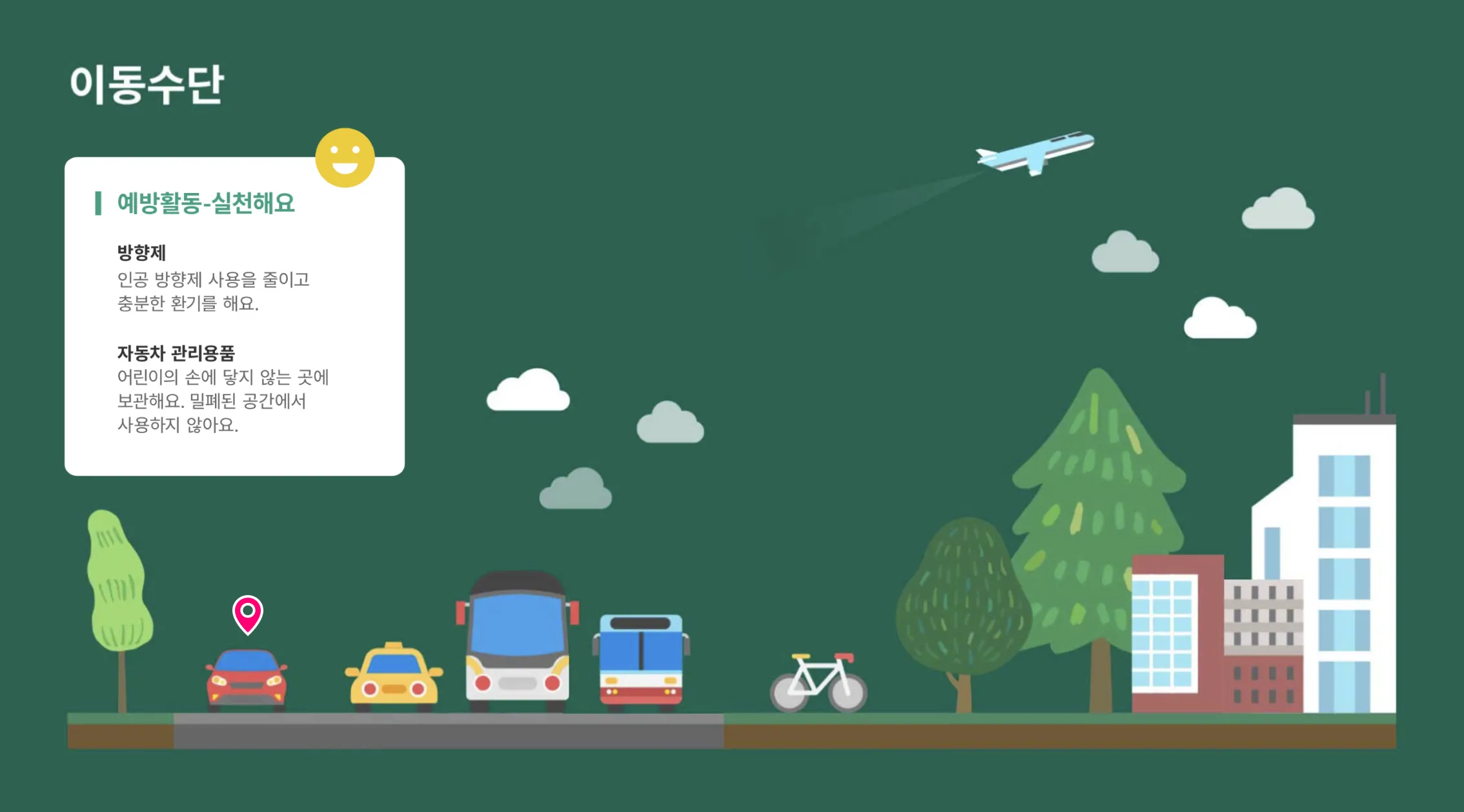 이동수단(개인 교통수단) 생활 속 환경유해인자 - 시트, 바닥매트, 방향제, 자동차관리 용품, 손잡이 구분되어 있습니다.